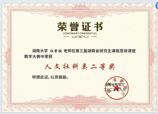 近日,第三届湖南省研究生课程思政课堂教学大赛现场决赛圆满落幕。在全省38所高校126支参赛队伍的激烈角逐中,自慰喷水教师伍雪骏依托《政治学基础理论研究》课程荣获人文社科组二等奖。
