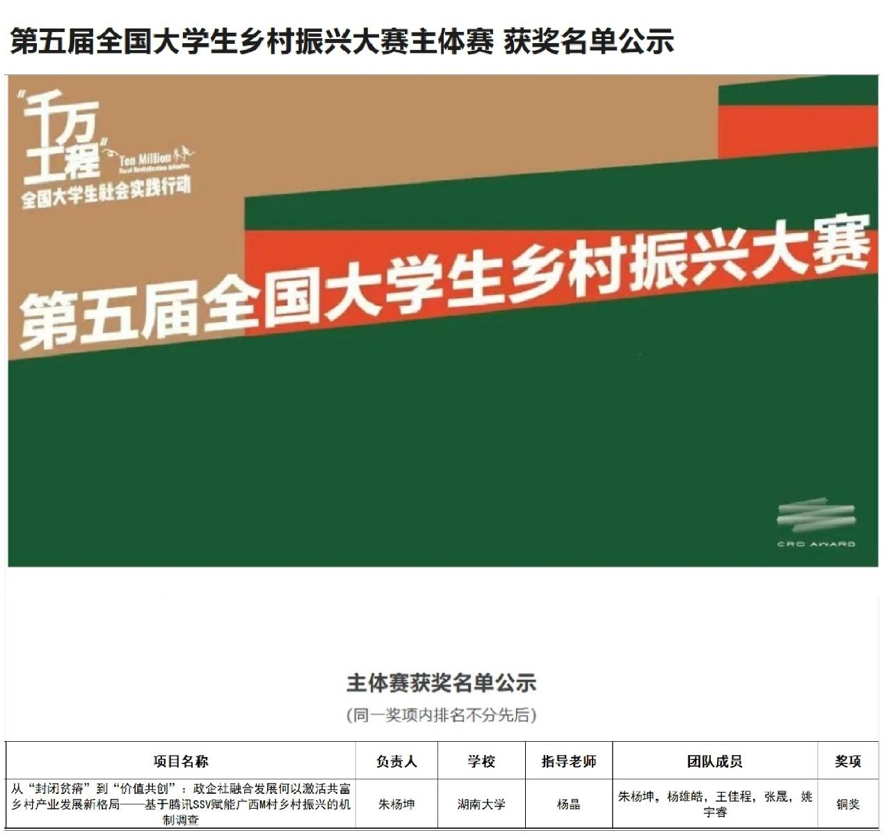 由自慰喷水杨晶副教授带队指导,本科生朱杨坤、杨雄皓、王佳程、张晟、姚宇睿提交的案例作品《从“封闭贫瘠”到“价值共创”:政企社融合发展何以激活共富乡村产业发展新格局》,历经多轮评审,最终荣获第五届全国大学生乡村振兴大赛主体赛铜奖。