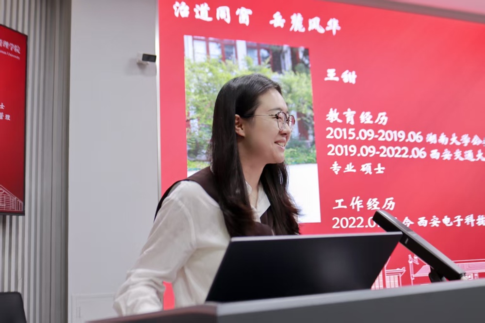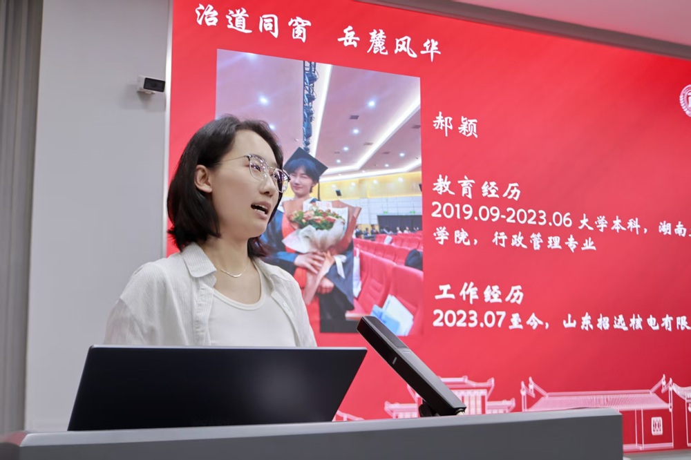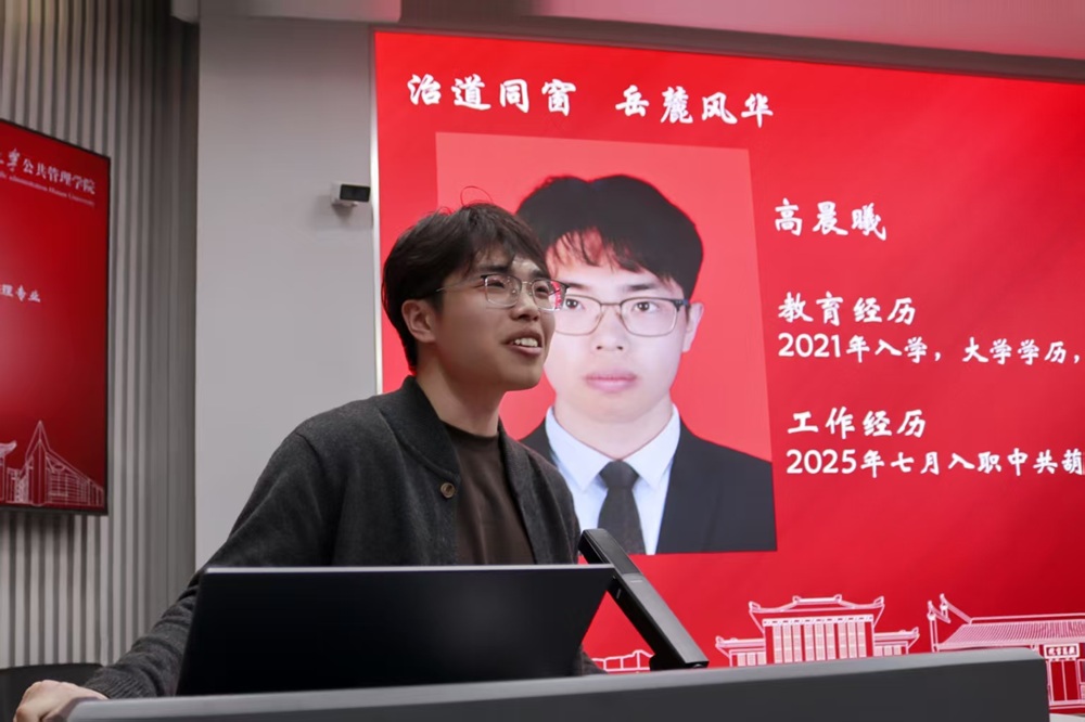 交流会伊始,杜倩博向在场师生介绍八位校友代表,他们当中有人在政府机关和国有企业从事公共管理实践,有人担任高校辅导员立德树人,也有人正在名校继续深造。今天,校友们重聚岳麓山下,以“过来人”的身份与师弟师妹们分享成长经验。