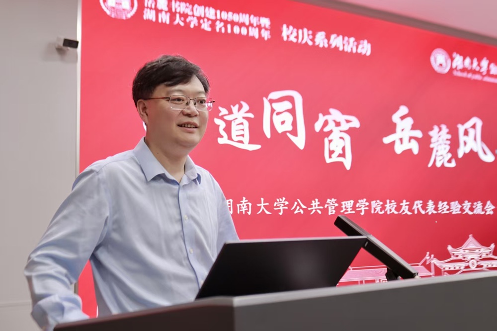 院长谭海波教授进行总结讲话。谭院长指出五大成长关键词:定目标、爱学习、重实践、有爱好、强韧性。他希望同学们能够充分汲取校友们的成长经验,笃定方向、笃实奋进,也祝愿校友们在各行各业继续发光,携手擦亮中国公共管理的“岳麓学派”这一亮眼品牌。