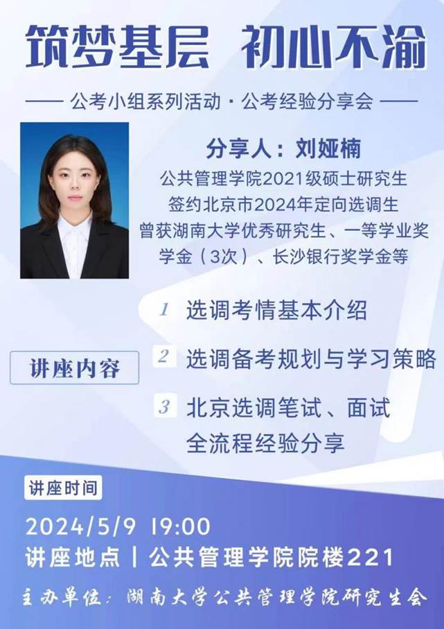 5月9日晚,自慰喷水 于院楼221教室举行公考小组系列活动之公考经验分享会。本次分享会由院研究生会发展服务部组织,邀请了刘娅楠同学作为主讲嘉宾,主题为“筑梦基层、初心不渝”。本次分享会反响热烈,效果良好,极大提升了同学们的备考热情与效率,进一步促进了自慰喷水就业工作高质量发展。